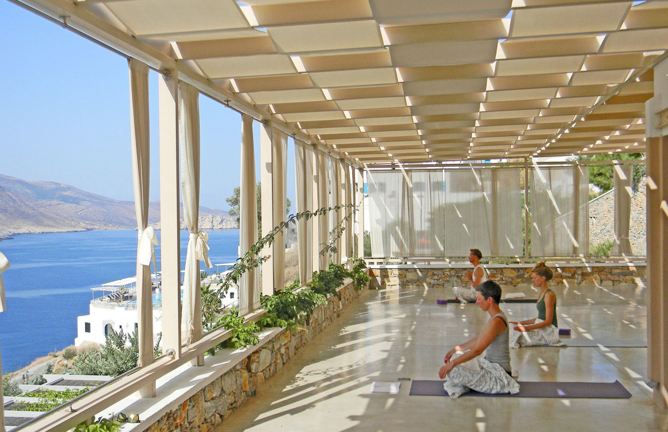 We will be a small group, a maximum of 13 ropes students, practicing every day in the astonishing setting of Amorgos Island in Greece. Outside the window the sea and hills beckon, the pool water shines and the clear air calls. For 6 nights and 7 days we will call this paradise home, with a ropes class every day, a daily buffet breakfast, free time to explore or relax, and an evening restorative class before dinner with gentle stretching, supported poses, and guided meditations. Every evening there’s dinner to enjoy together and time to hang out afterwards. There’s vegan and vegetarian food, as well as traditional Greek cuisine that includes meat and fish.